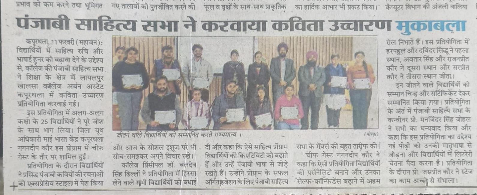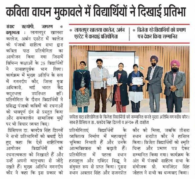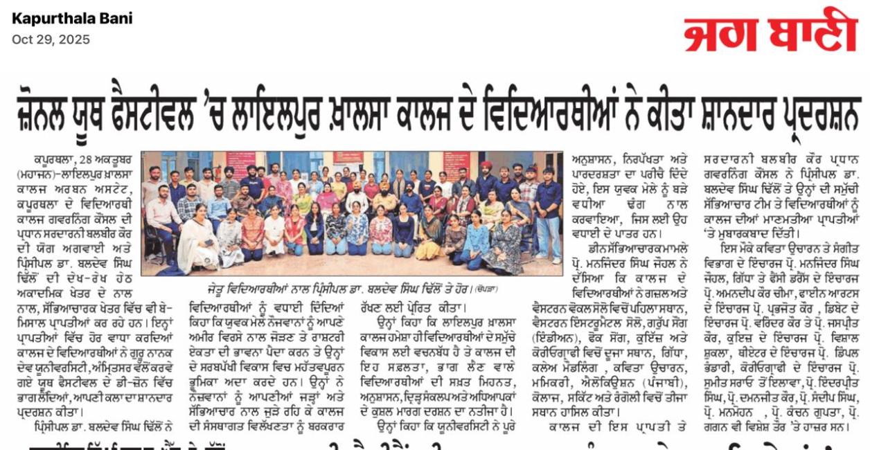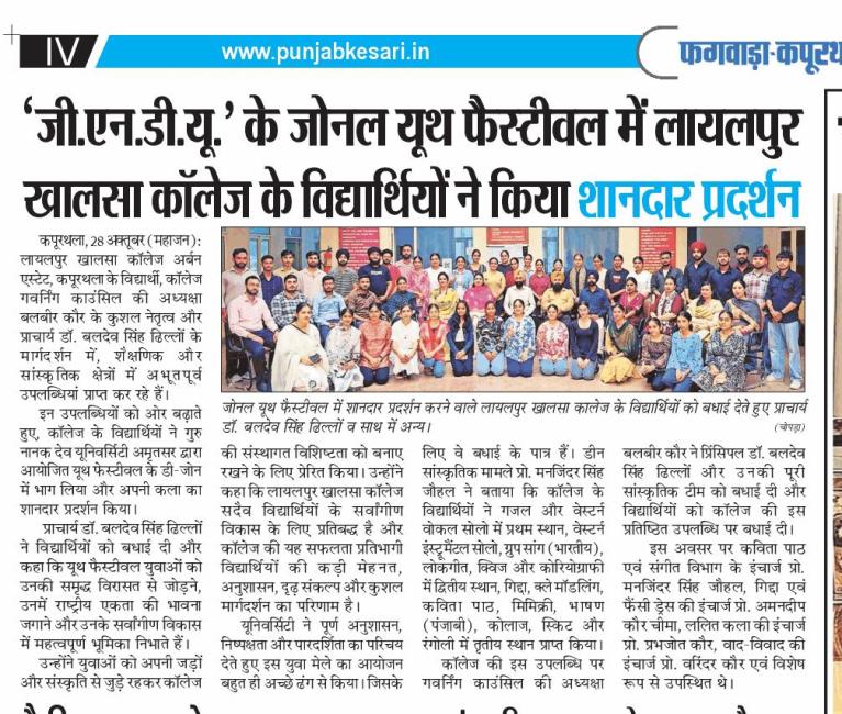 ਗੁਰੂ ਨਾਨਕ ਦੇਵ ਯੂਨੀਵਰਸਿਟੀ ਦੇ ਜ਼ੋਨਲ ਯੂਥ ਫੈਸਟੀਵਲ ਵਿੱਚ ਲਾਇਲਪੁਰ ਖ਼ਾਲਸਾ ਕਾਲਜ ਕਪੂਰਥਲਾ ਦੇ ਵਿਦਿਆਰਥੀਆਂ ਨੇ ਕੀਤਾ ਸ਼ਾਨਦਾਰ ਪ੍ਰਦਰਸ਼ਨ|