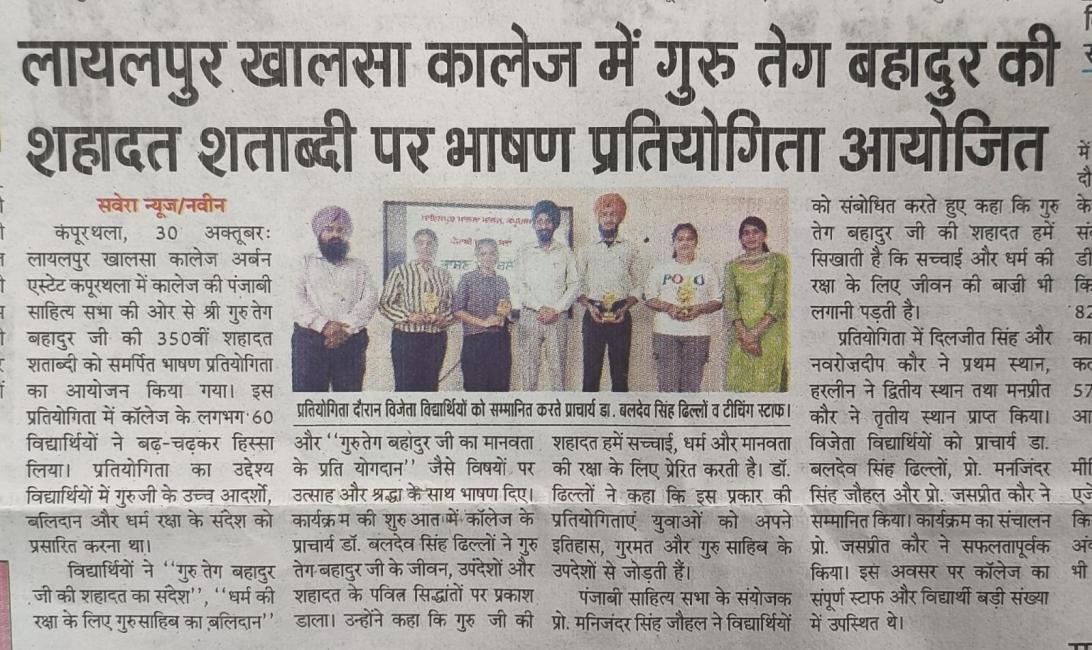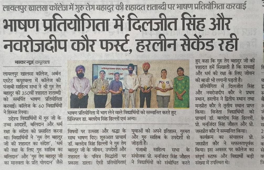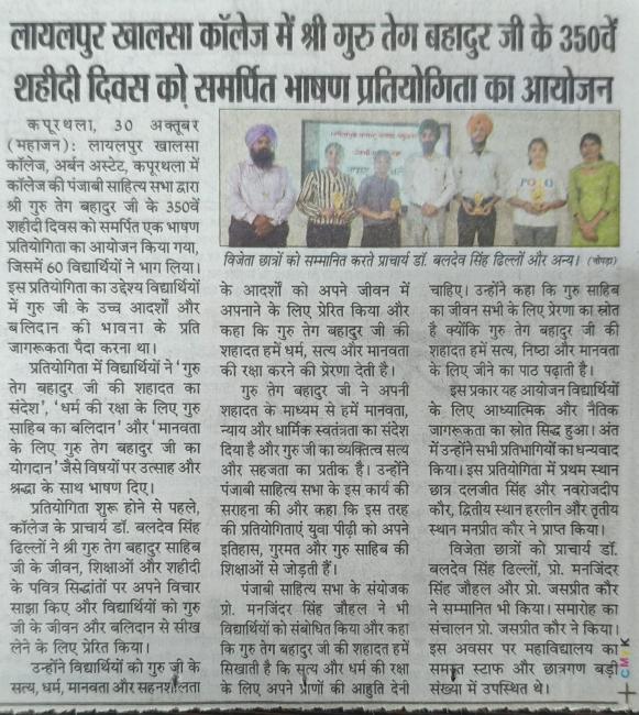 ਸ਼੍ਰੀ ਗੁਰੂ ਤੇਗ਼ ਬਹਾਦਰ ਜੀ ਦੀ 350 ਸਾਲਾ ਸ਼ਹੀਦੀ ਸ਼ਤਾਬਦੀ ਨੂੰ ਸਮਰਪਿਤ ਕਰਵਾਏ ਭਾਸ਼ਣ ਮੁਕਾਬਲੇ