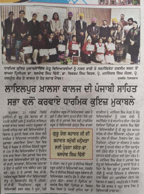 ਲਾਇਲਪੁਰ ਖ਼ਾਲਸਾ ਕਾਲਜ, ਕਪੂਰਥਲਾ ਵਿਖੇ ਮਿਡਲ ਅਤੇ ਸੀਨੀਅਰ ਸੈਕੰਡਰੀ ਸਕੂਲਾਂ ਦੇ ਕਰਵਾਏ ਧਾਰਮਿਕ ਕੁਇਜ਼ ਮੁਕਾਬਲੇ