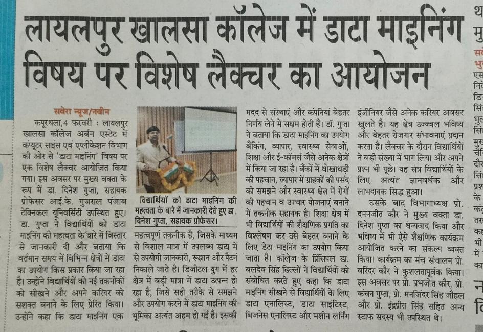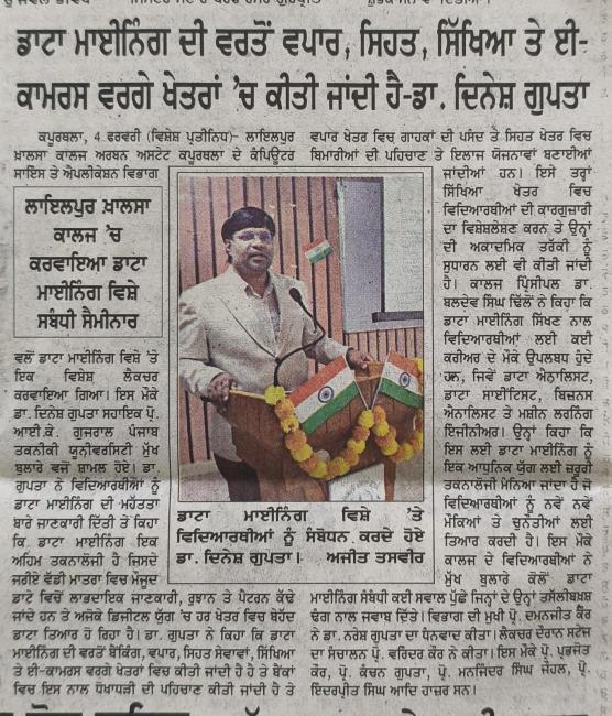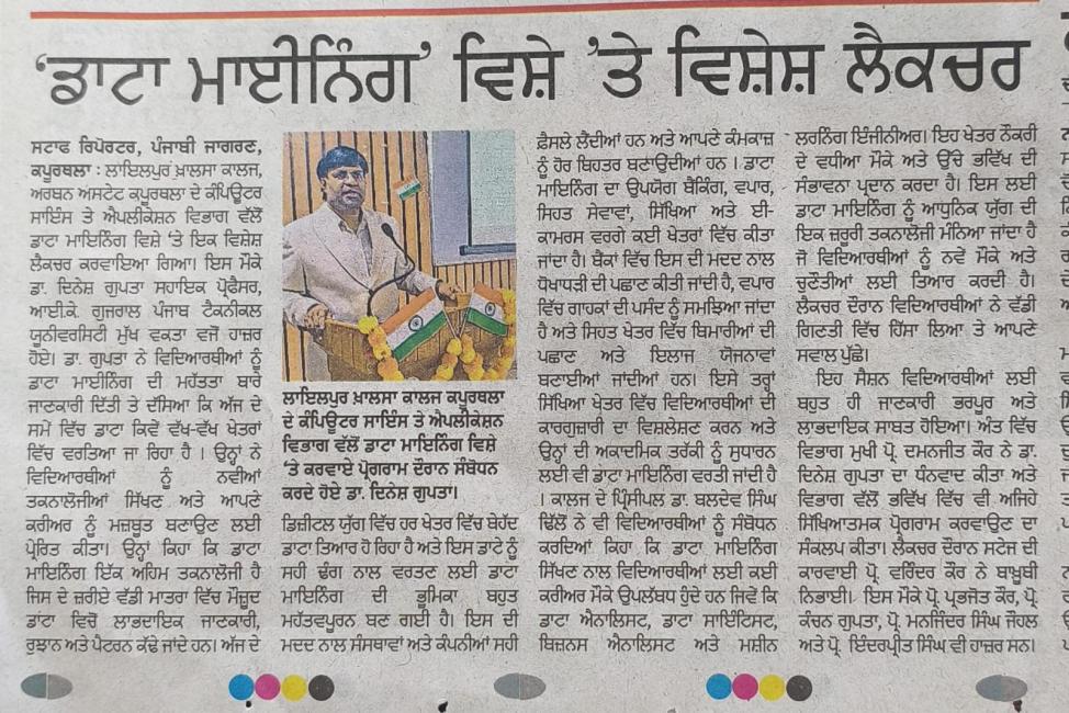 ਕੰਪਿਊਟਰ ਸਾਇੰਸ ਅਤੇ ਐਪਲੀਕੇਸ਼ਨ ਵਿਭਾਗ ਵੱਲੋਂ ਡਾਟਾ ਮਾਇਨਿੰਗ ਵਿਸ਼ੇ ‘ਤੇ ਕਰਵਾਇਆ ਵਿਸ਼ੇਸ਼ ਲੈਕਚਰ