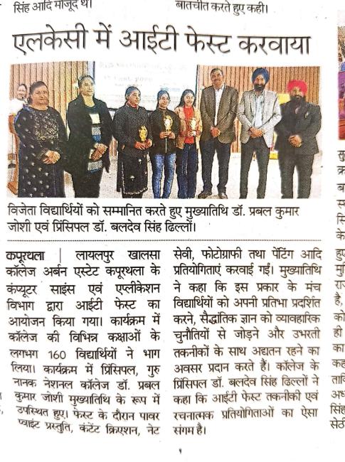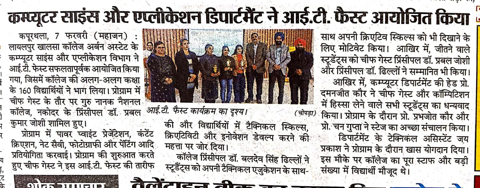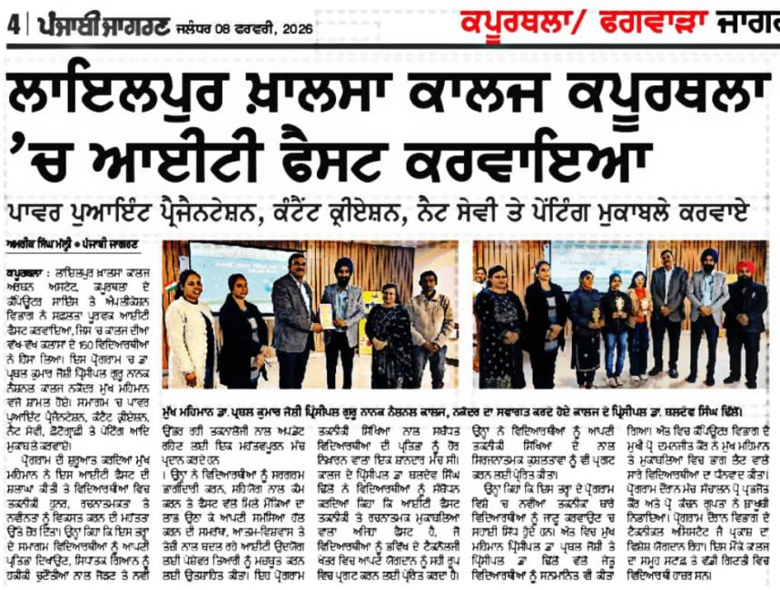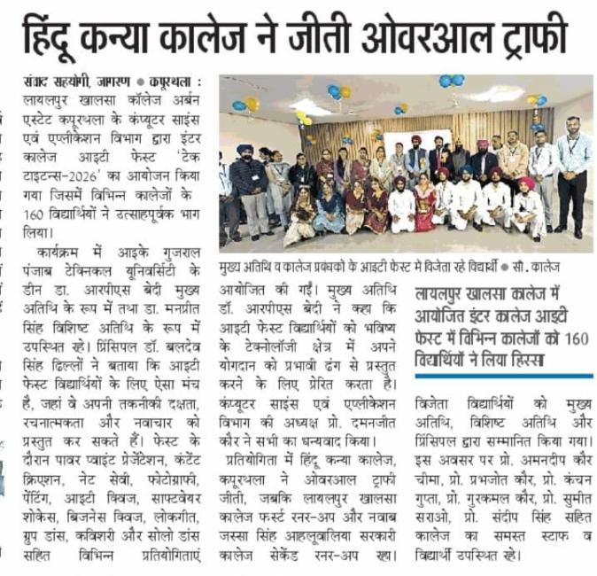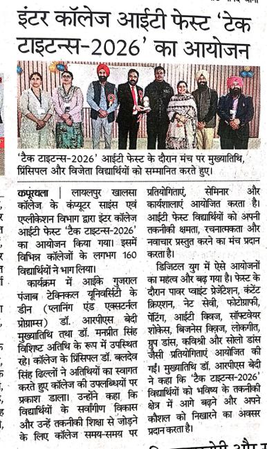 ਕੰਪਿਊਟਰ ਸਾਇੰਸ ਵਿਭਾਗ ਨੇ ਸਫ਼ਲਤਾ ਪੂਰਵਕ ਆਈ ਟੀ ਫੈਸਟ - 2026 ਆਯੋਜਿਤ ਕੀਤਾ