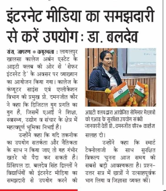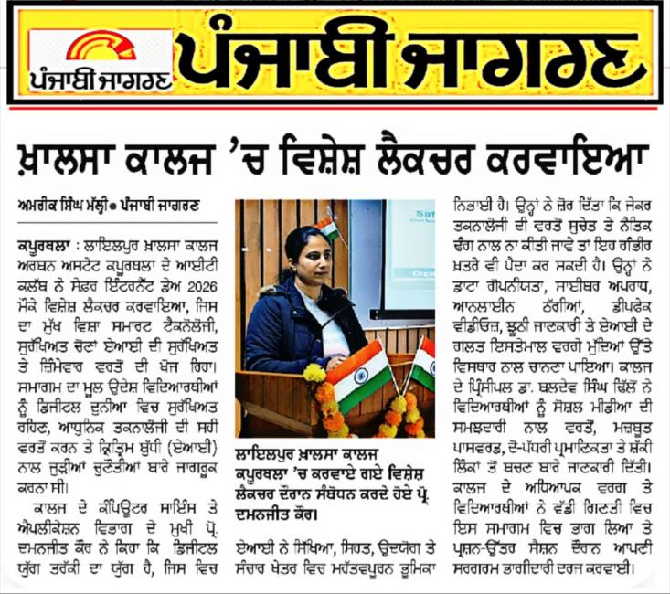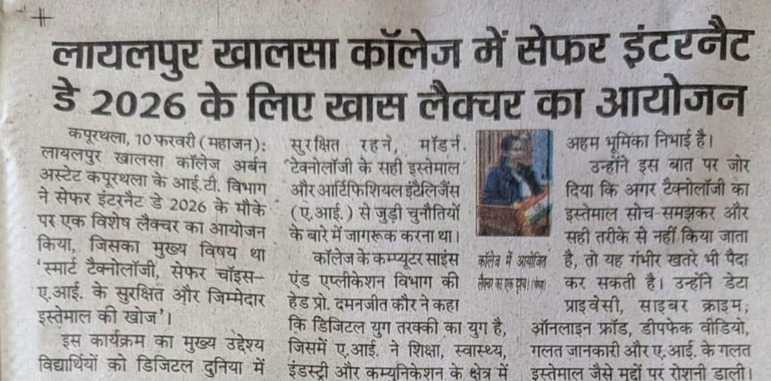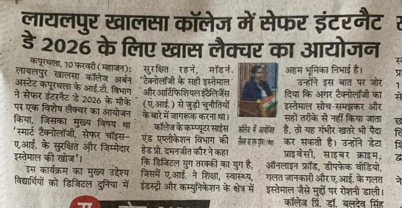 ਸੇਫ਼ਰ ਇੰਟਰਨੈੱਟ ਡੇਅ 2026 ਨੂੰ ਸਮਰਪਿਤ ਵਿਸ਼ੇਸ਼ ਲੈਕਚਰ ਕਰਵਾਇਆ