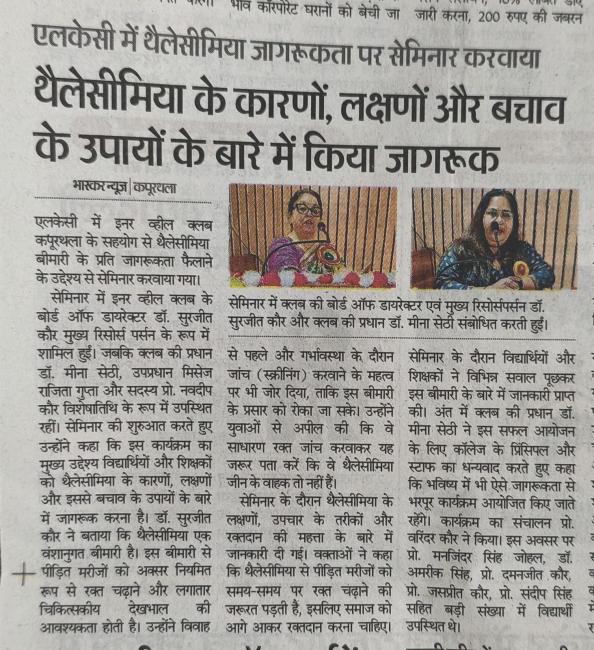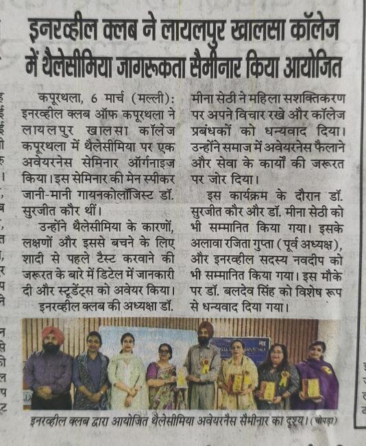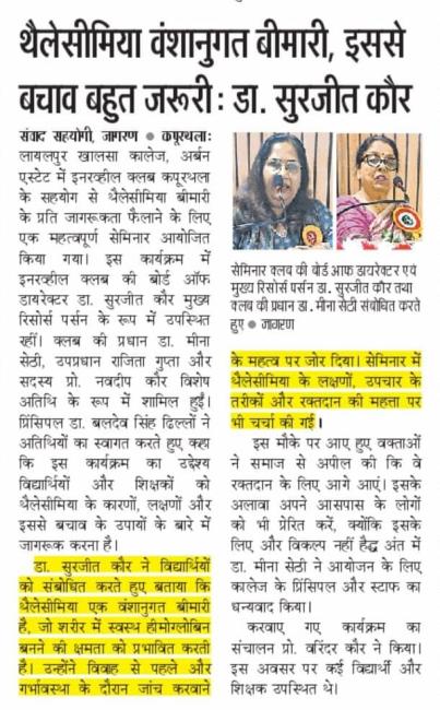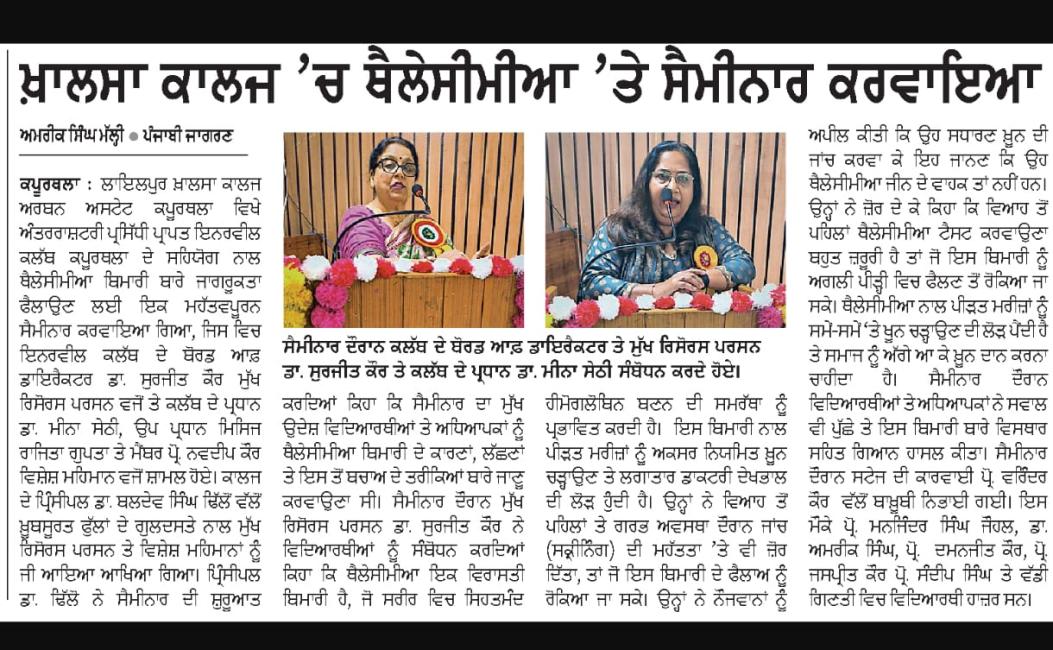 Seminar on Thalassemia Awareness Organized at Lyallpur Khalsa College, Kapurthala by Internationally Renowned Inner Wheel Club
