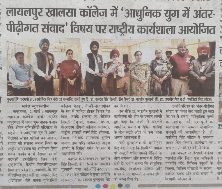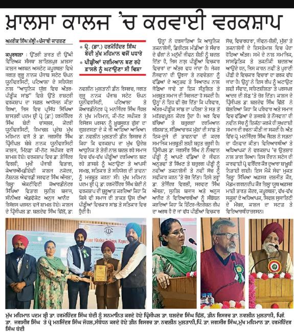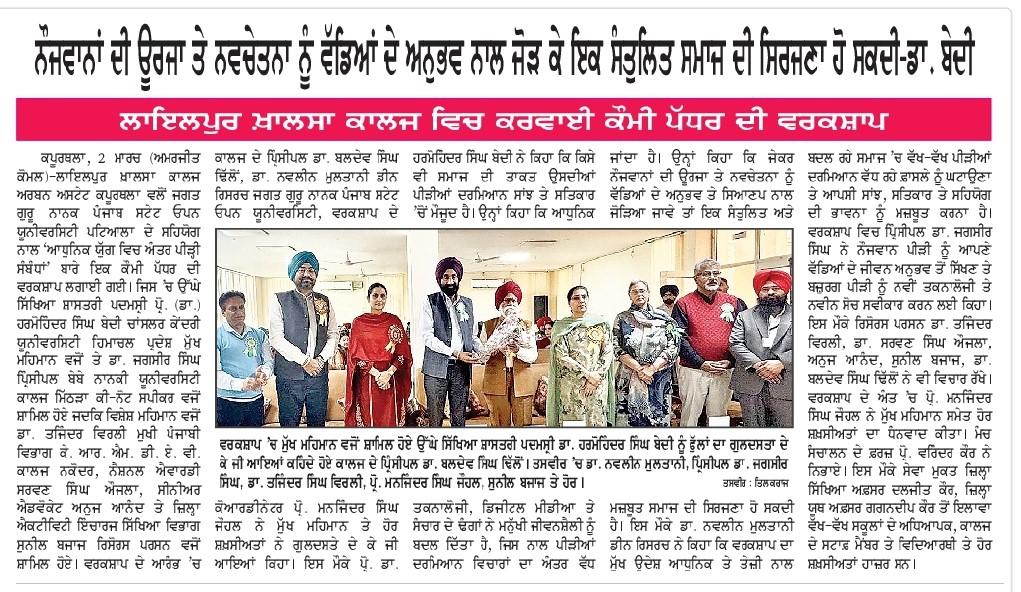 ਆਧੁਨਿਕ ਯੁੱਗ ਵਿੱਚ ਅੰਤਰ-ਪੀੜ੍ਹੀਕ ਸਾਂਝ (Promoting Inter-Generational Bonding in Modern Era: Bridging Generations, Strengthening Society) ਵਿਸ਼ੇ ਉੱਤੇ ਰਾਸ਼ਟਰੀ ਵਰਕਸ਼ਾਪ ਦਾ ਆਯੋਜਨ