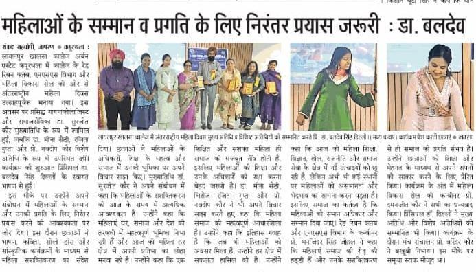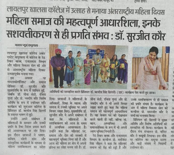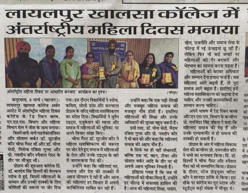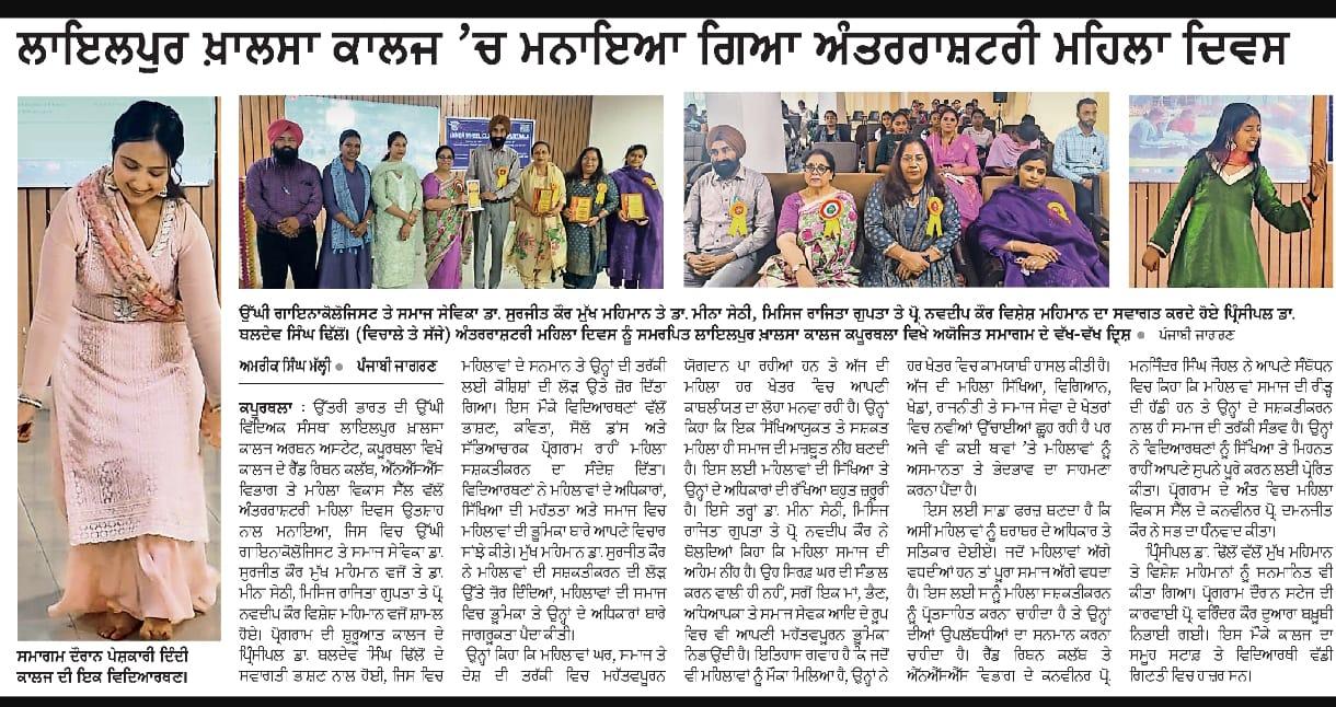 ਲਾਇਲਪੁਰ ਖ਼ਾਲਸਾ ਕਾਲਜ, ਕਪੂਰਥਲਾ ਵਿਖੇ ਅੰਤਰਰਾਸ਼ਟਰੀ ਮਹਿਲਾ ਦਿਵਸ ਉਤਸ਼ਾਹ ਨਾਲ ਮਨਾਇਆ