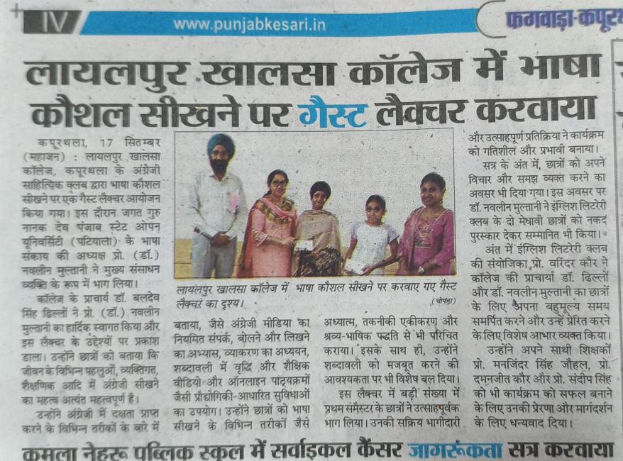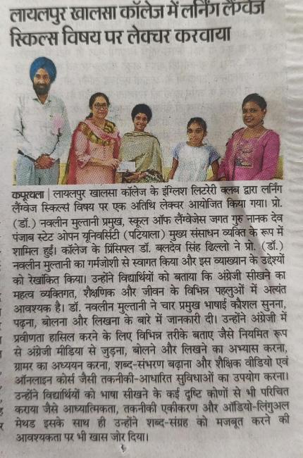 ਲਰਨਿੰਗ ਲੈਂਗੁਏਜ ਸਕਿੱਲਜ਼ ਵਿਸ਼ੇ ਤੇ ਕਰਵਾਇਆ ਗੈਸਟ ਲੈਕਚਰ|