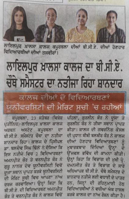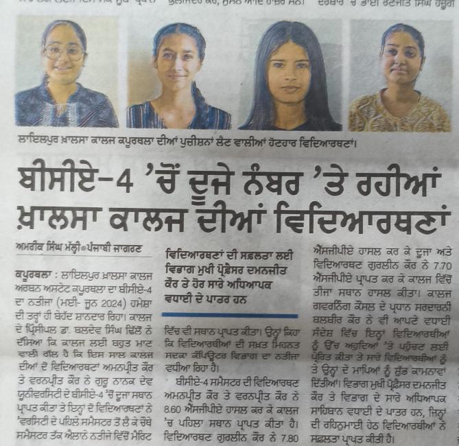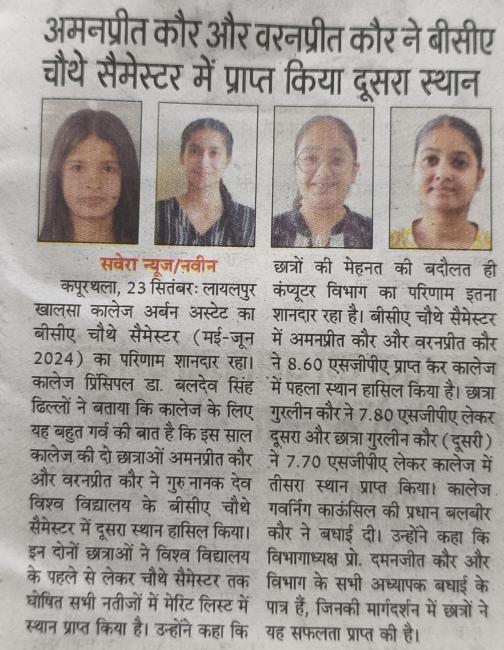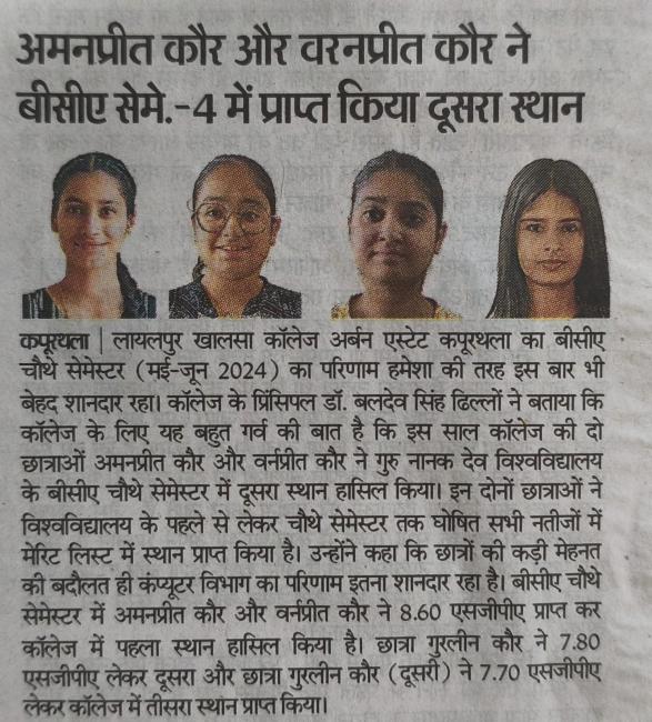 ਅਮਨਪ੍ਰੀਤ ਕੌਰ ਅਤੇ ਵਰਨਪ੍ਰੀਤ ਕੌਰ ਨੇ ਗੁਰੂ ਨਾਨਕ ਦੇਵ ਯੂਨੀਵਰਸਿਟੀ ਅੰਮ੍ਰਿਤਸਰ ਦੇ ਬੀ. ਸੀ. ਏ. ਚੌਥੇ ਸਮੈਸਟਰ ਵਿੱਚੋਂ ਪ੍ਰਾਪਤ ਕੀਤਾ ਦੂਜਾ ਸਥਾਨ| ਇਸ ਸਾਲ ਕਾਲਜ ਦੀਆਂ ਦੋ ਵਿਦਿਆਰਥਣਾਂ ਅਮਨਪ੍ਰੀਤ ਕੌਰ ਅਤੇ ਵਰਨਪ੍ਰੀਤ ਕੌਰ ਨੇ ਗੁਰੂ ਨਾਨਕ ਦੇਵ ਯੂਨੀਵਰਸਿਟੀ ਦੇ ਬੀ ਸੀ ਏ ਚੌਥੇ ਸਮੈਸਟਰ ਵਿੱਚੋਂ ਦੂਸਰਾ ਸਥਾਨ ਪ੍ਰਾਪਤ ਕੀਤਾ ਅਤੇ ਇਨ੍ਹਾਂ ਦੋ ਵਿਦਿਆਰਥਣਾਂ ਨੇ ਯੂਨੀਵਰਸਿਟੀ ਦੇ ਪਹਿਲੇ ਸਮੈਸਟਰ ਤੋਂ ਲੈ ਕੇ ਚੌਥੇ ਸਮੈਸਟਰ ਤੱਕ ਐਲਾਨੇ ਨਤੀਜੇ ਵਿੱਚੋਂ ਮੈਰਿਟ ਵਿੱਚ ਵੀ ਸਥਾਨ ਪ੍ਰਾਪਤ ਕੀਤਾ। ਵਿਦਿਆਰਥਣ ਗੁਰਲੀਨ ਕੌਰ ਨੇ 7.80 ਐਸ ਜੀ ਪੀ ਏ ਹਾਸਲ ਕਰਕੇ ਦੂਜਾ ਅਤੇ ਵਿਦਿਆਰਥਣ ਗੁਰਲੀਨ ਕੌਰ ਨੇ 7.70 ਐਸ ਜੀ ਪੀ ਏ ਪ੍ਰਾਪਤ ਕਰ ਕੇ ਕਾਲਜ ਵਿੱਚੋਂ ਤੀਜਾ ਸਥਾਨ ਹਾਸਿਲ ਕੀਤਾ |