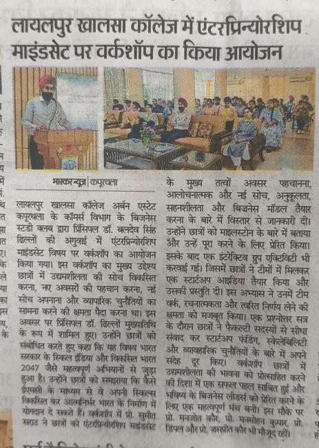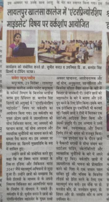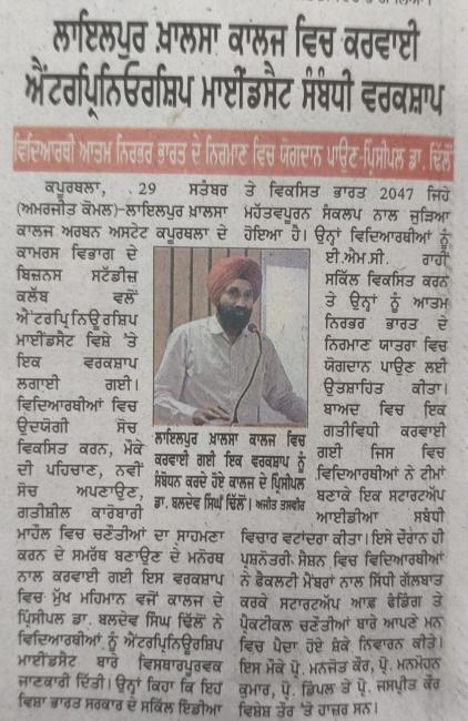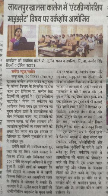 ਕਾਮਰਸ ਵਿਭਾਗ ਦੇ ਬਿਜ਼ਨਸ ਸਟੱਡੀਜ਼ ਕਲੱਬ ਵੱਲੋਂ "ਐਂਟਰਪ੍ਰਿਨਿਊਰਸ਼ਿਪ ਮਾਈਂਡਸੈਟ " ਵਿਸ਼ੇ 'ਤੇ ਵਰਕਸ਼ਾਪ ਦਾ ਆਯੋਜਨ|