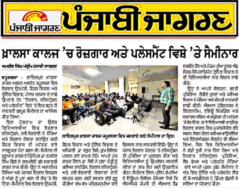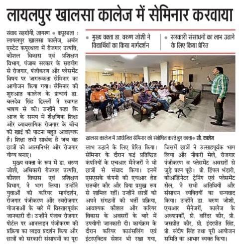 ਰੋਜ਼ਗਾਰ ਅਤੇ ਪਲੇਸਮੈਂਟ ਵਿਸ਼ੇ ਤੇ ਕਰਾਇਆ ਸੈਮੀਨਾਰ