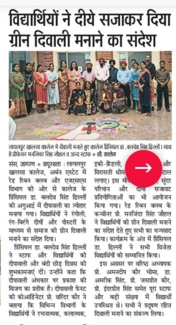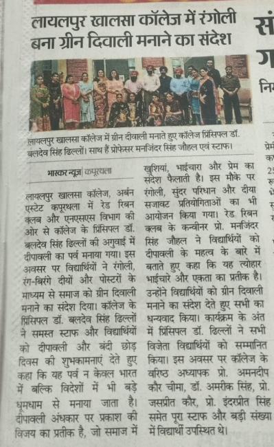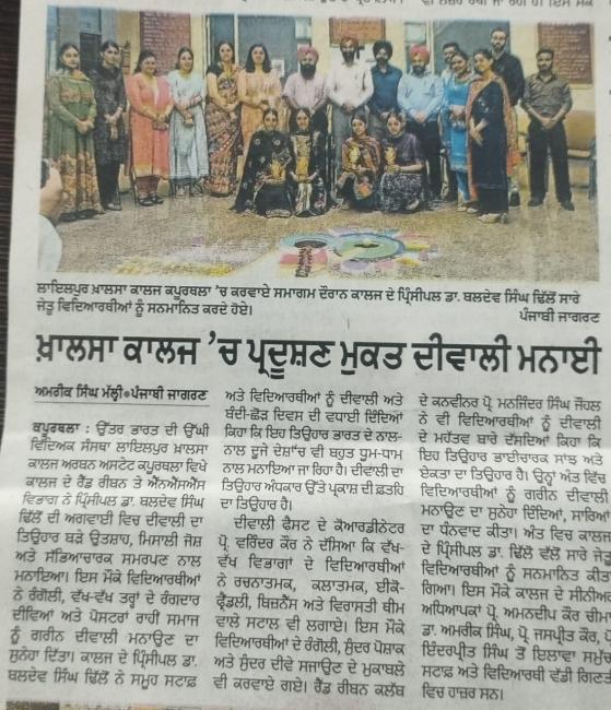 ਲਾਇਲਪੁਰ ਖ਼ਾਲਸਾ ਕਾਲਜ ਕਪੂਰਥਲਾ ਵਿਖੇ ਪ੍ਰਦੂਸ਼ਣ ਮੁਕਤ ਦਿਵਾਲੀ ਮਨਾਈ