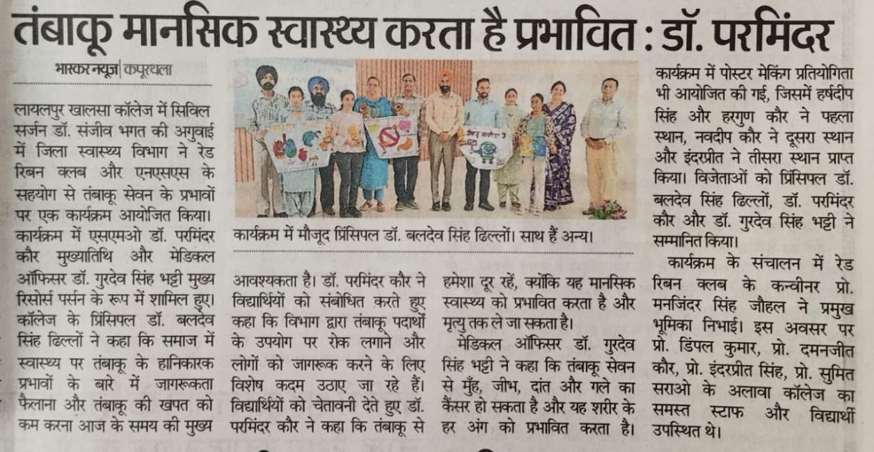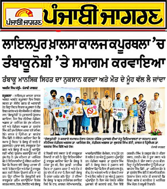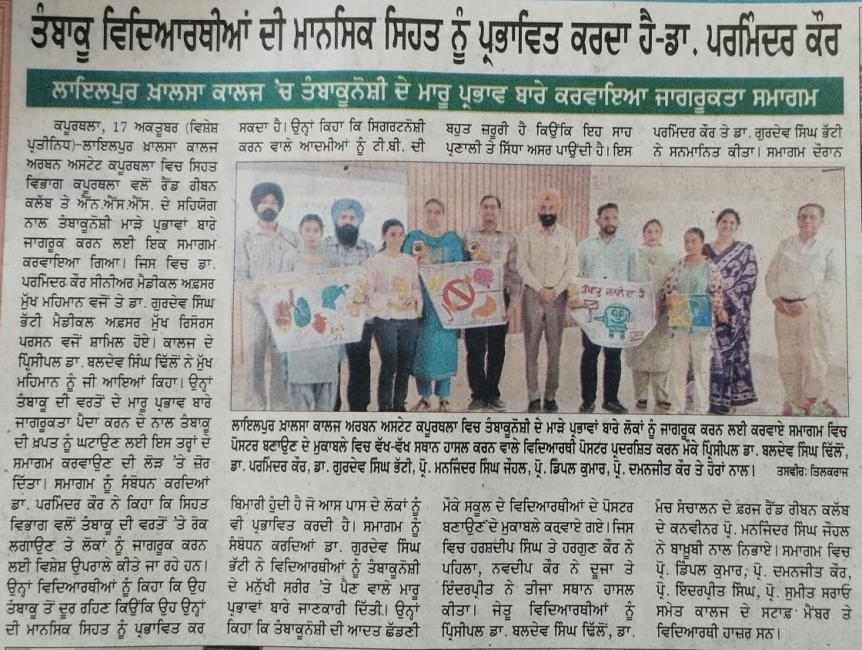 ਲਾਇਲਪੁਰ ਖ਼ਾਲਸਾ ਕਾਲਜ ਕਪੂਰਥਲਾ ਵਿਖੇ ਜ਼ਿਲ੍ਹਾ ਸਿਹਤ ਵਿਭਾਗ ਵੱਲੋਂ 'ਤੰਬਾਕੂਨੋਸ਼ੀ' ਤੇ ਕਰਾਇਆ ਸਮਾਗਮ