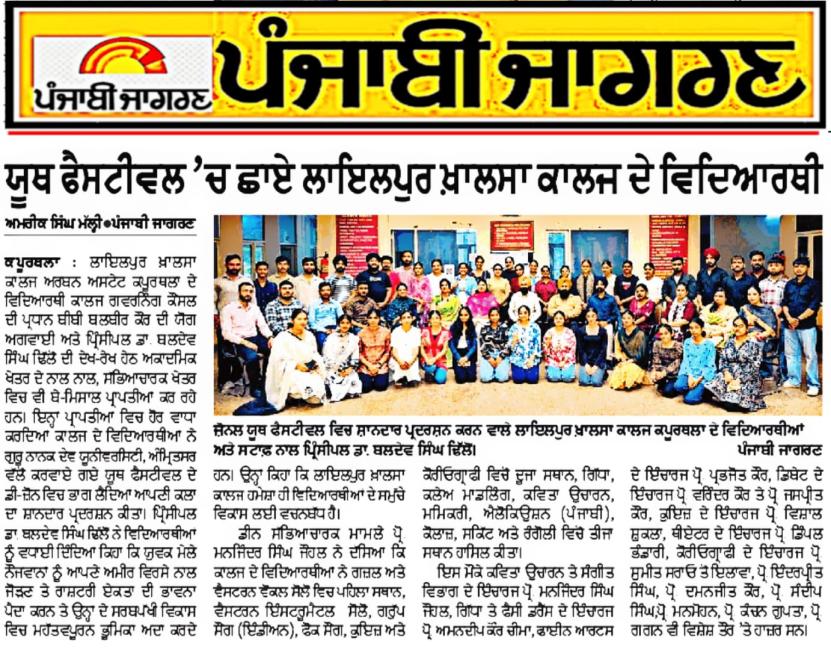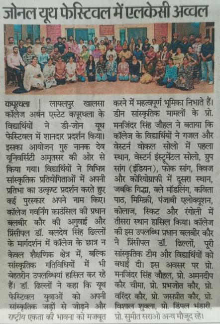 ਗੁਰੂ ਨਾਨਕ ਦੇਵ ਯੂਨੀਵਰਸਿਟੀ ਦੇ ਜ਼ੋਨਲ ਯੂਥ ਫੈਸਟੀਵਲ ਵਿੱਚ ਲਾਇਲਪੁਰ ਖ਼ਾਲਸਾ ਕਾਲਜ ਕਪੂਰਥਲਾ ਦੇ ਵਿਦਿਆਰਥੀਆਂ ਨੇ ਕੀਤਾ ਸ਼ਾਨਦਾਰ ਪ੍ਰਦਰਸ਼ਨ|