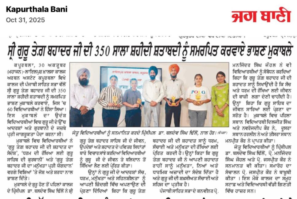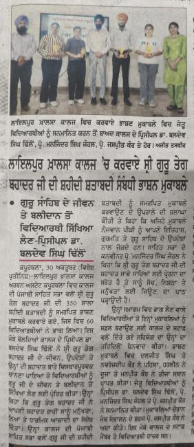 ਸ਼੍ਰੀ ਗੁਰੂ ਤੇਗ਼ ਬਹਾਦਰ ਜੀ ਦੀ 350 ਸਾਲਾ ਸ਼ਹੀਦੀ ਸ਼ਤਾਬਦੀ ਨੂੰ ਸਮਰਪਿਤ ਕਰਵਾਏ ਭਾਸ਼ਣ ਮੁਕਾਬਲੇ