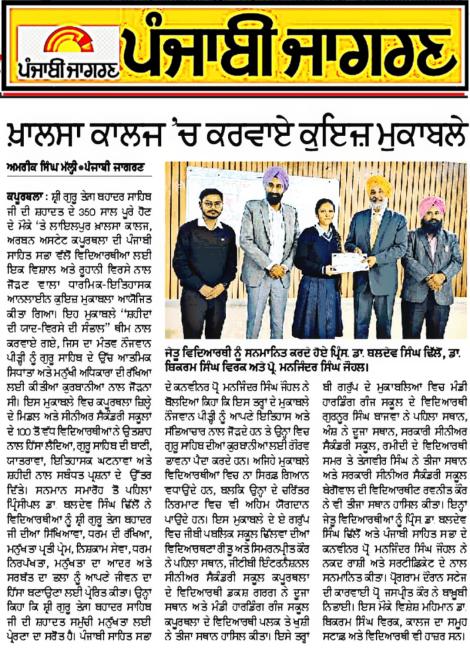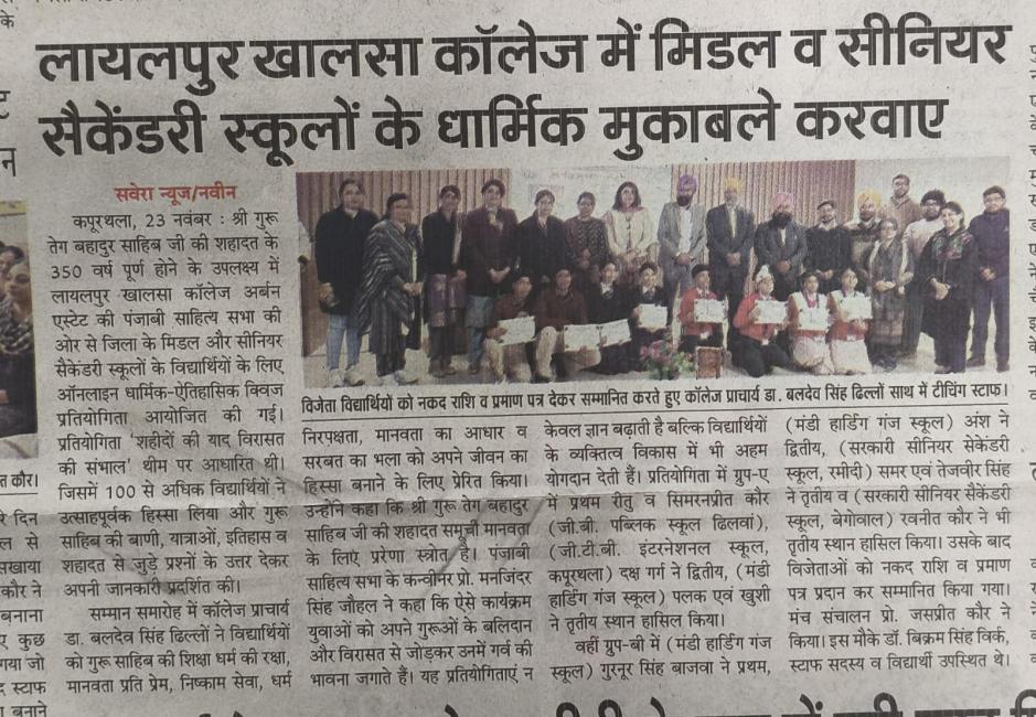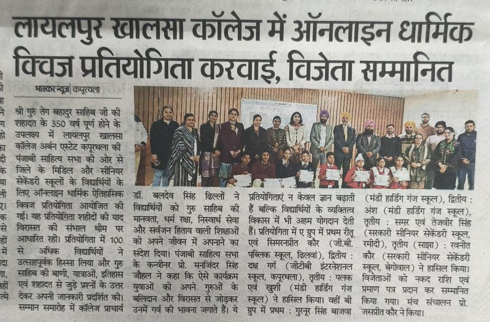 ਲਾਇਲਪੁਰ ਖ਼ਾਲਸਾ ਕਾਲਜ, ਕਪੂਰਥਲਾ ਵਿਖੇ ਮਿਡਲ ਅਤੇ ਸੀਨੀਅਰ ਸੈਕੰਡਰੀ ਸਕੂਲਾਂ ਦੇ ਕਰਵਾਏ ਧਾਰਮਿਕ ਕੁਇਜ਼ ਮੁਕਾਬਲੇ