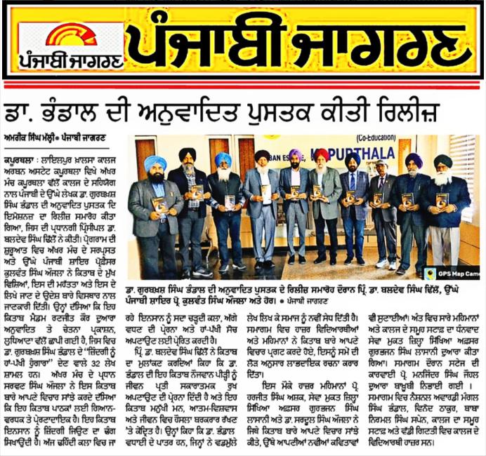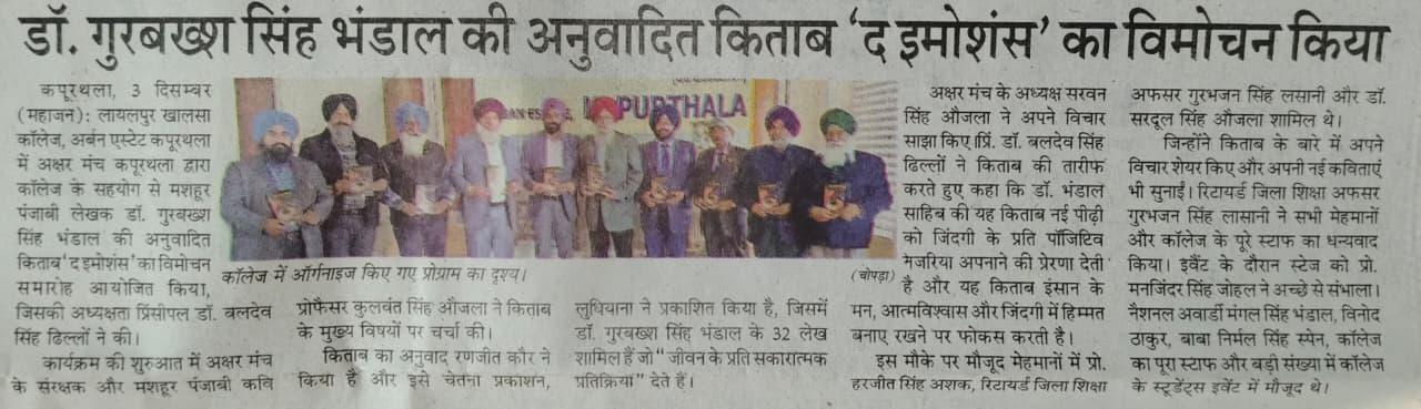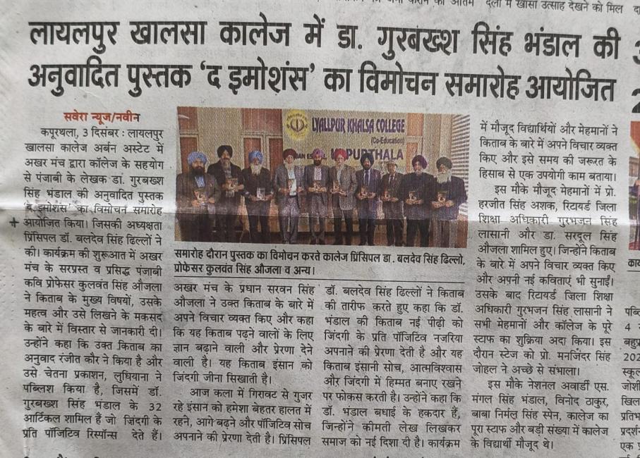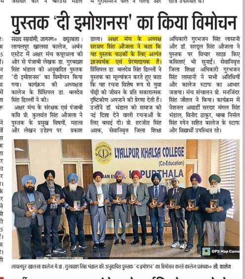 ਡਾ. ਗੁਰਬਖ਼ਸ਼ ਸਿੰਘ ਭੰਡਾਲ ਦੀ ਅਨੁਵਾਦਿਤ ਪੁਸਤਕ 'The Emotions' ਦਾ ਰਿਲੀਜ਼ ਸਮਾਰੋਹ ਆਯੋਜਿਤ